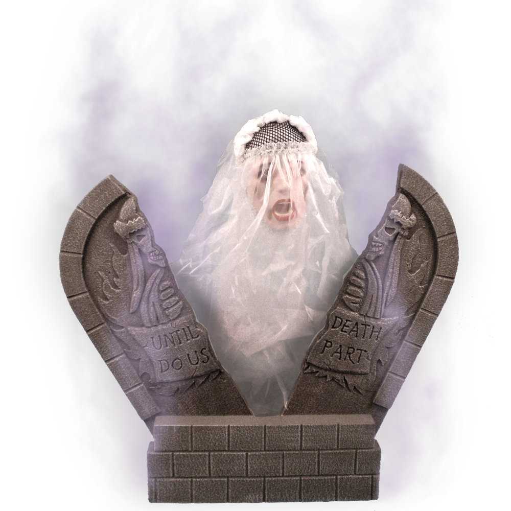 The tombstone is splitting! The ghostly head of a forsaken bride rises through, looking for revenge. Sound, Timer or Footpad Activated!