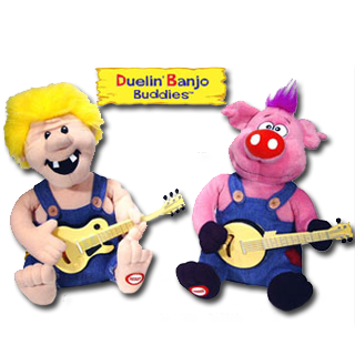 These hilarious 14" high backwoods characters play the hit song "Dueling Banjos" as they banter back and forth for almost 2 minutes. Using infrared sensors, they play in harmony UP TO 10 FEET APART! Each doll has 3 AA batteries included (for DEMO/TRY ME purposes only).